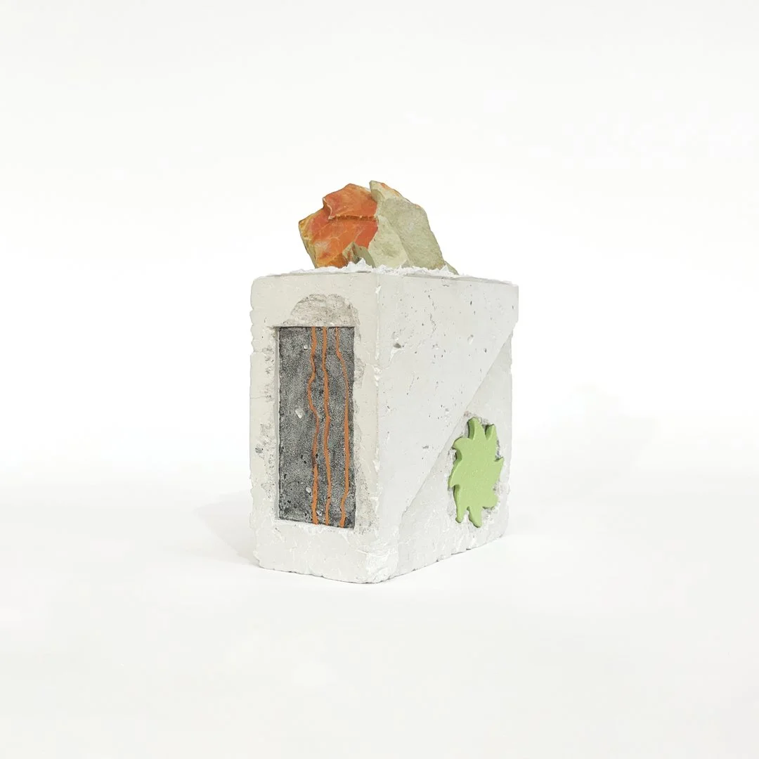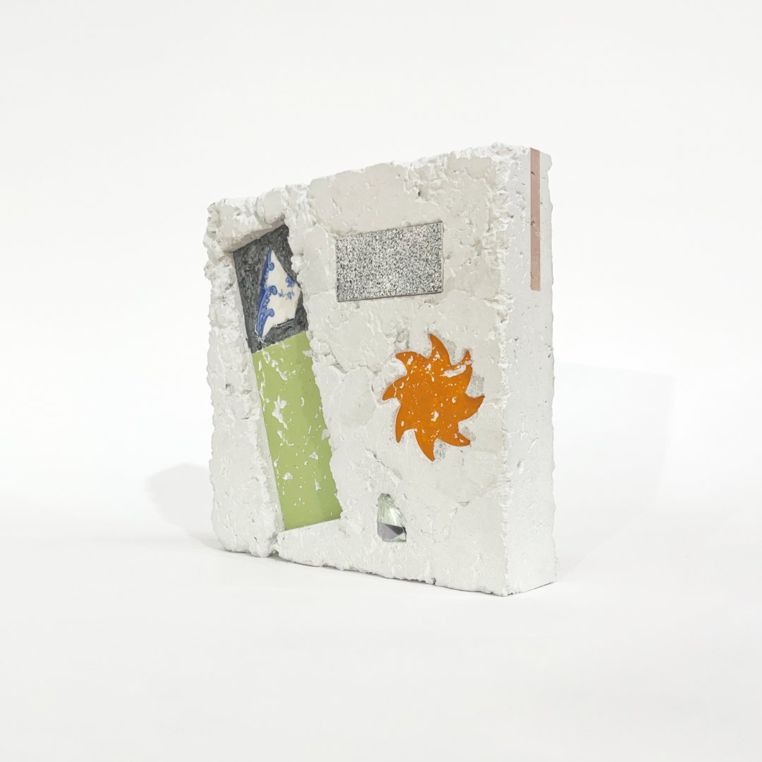 Remnants, 2024, 23k red gold, varnish and enamel on glass, River tile and porcelain,Beach driftwood, Murrumbidgee River natural pigments, Sand and acrylic housed within concrete, 26.5 x 21 x 8cm