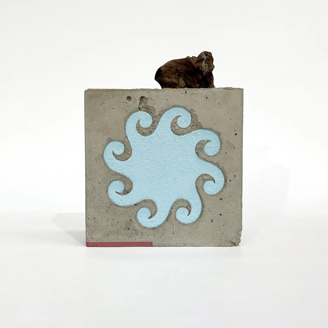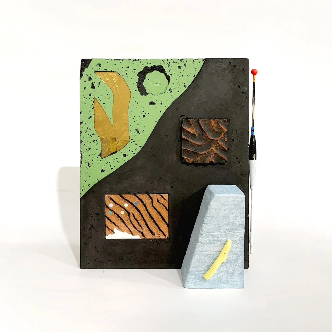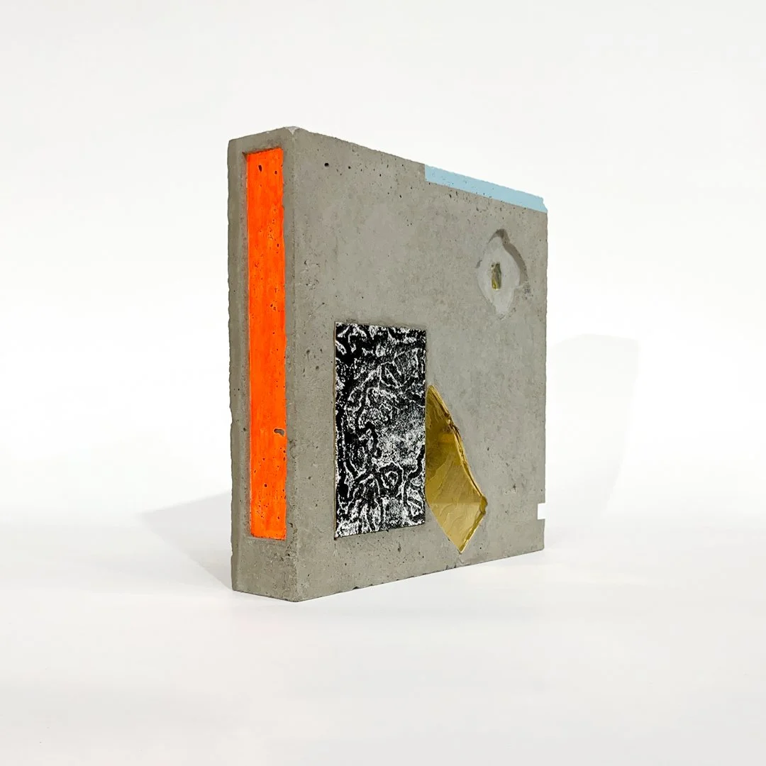 Five Shores, 2024, 23k red gold, 12k white gold, varnish and enamel on glass, Screen printing ink on board, Beach brick, River tile and porcelain, Murrumbidgee River natural pigments, Acrylic and enamel housed within concrete, 25 x W 25 x D 6.5cm